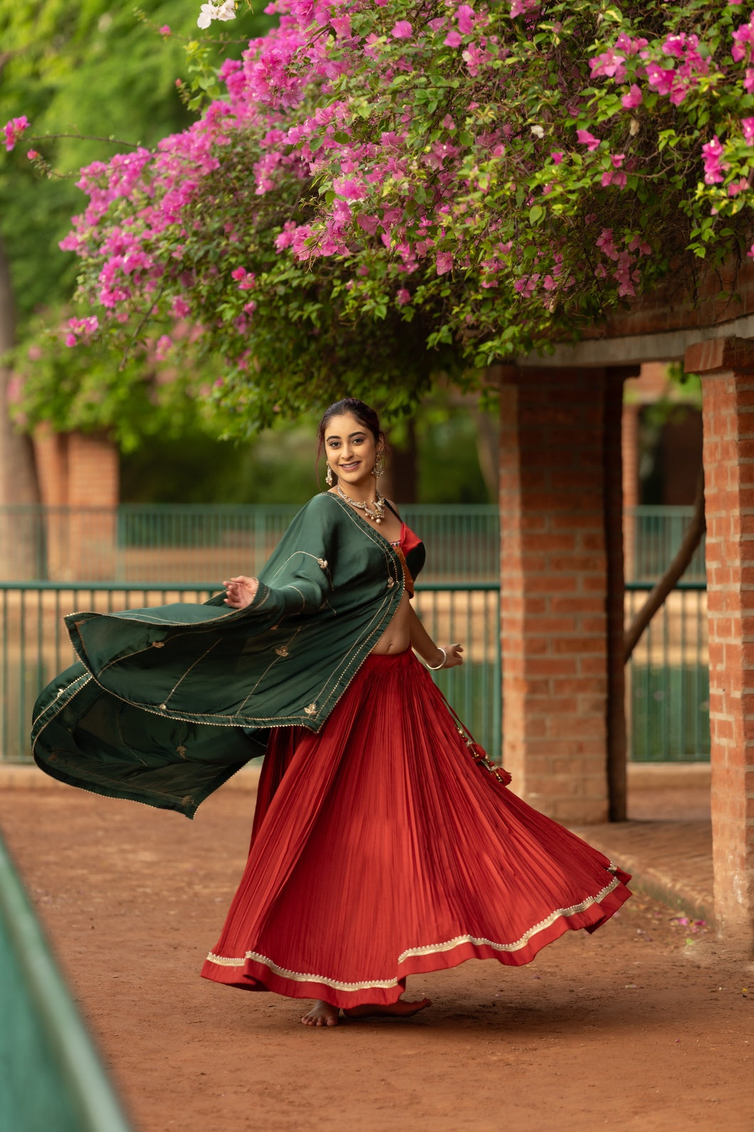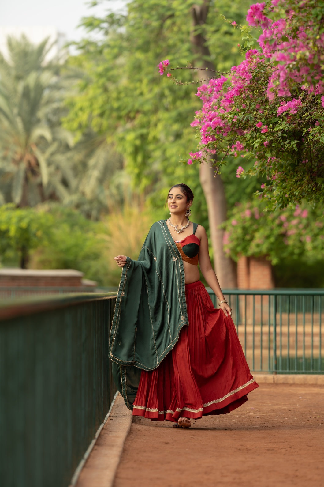 The Eira skirt features a rich rust tone in breathable maska cotton, styled in soft plates for structure and movement. Accented with a fine golden lace finish, this skirt is ideal for summer weddings and festive events.