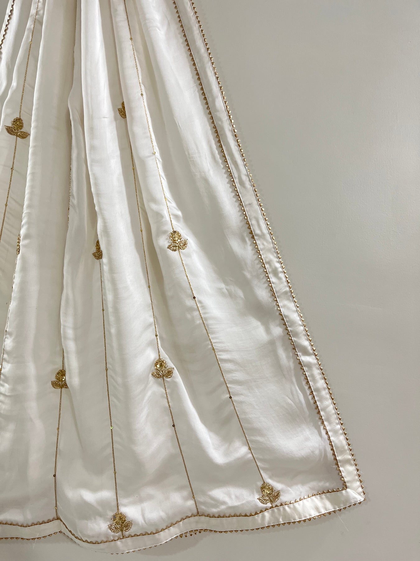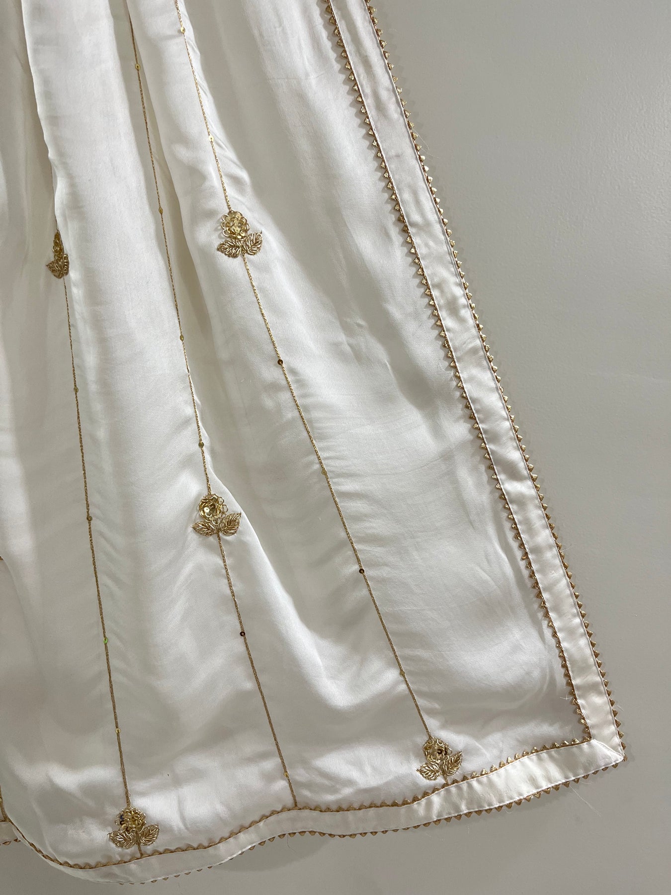 Graceful and versatile, this Off-White Dupatta is a timeless wardrobe essential. Crafted in luxurious georgette satin, it features intricate hand embroidery in floral and linear designs using jardori, ari, and tikki work. Its soft hue pairs beautifully with vibrant or neutral outfits, making it a perfect pick for weddings, poojas, and festive events.
