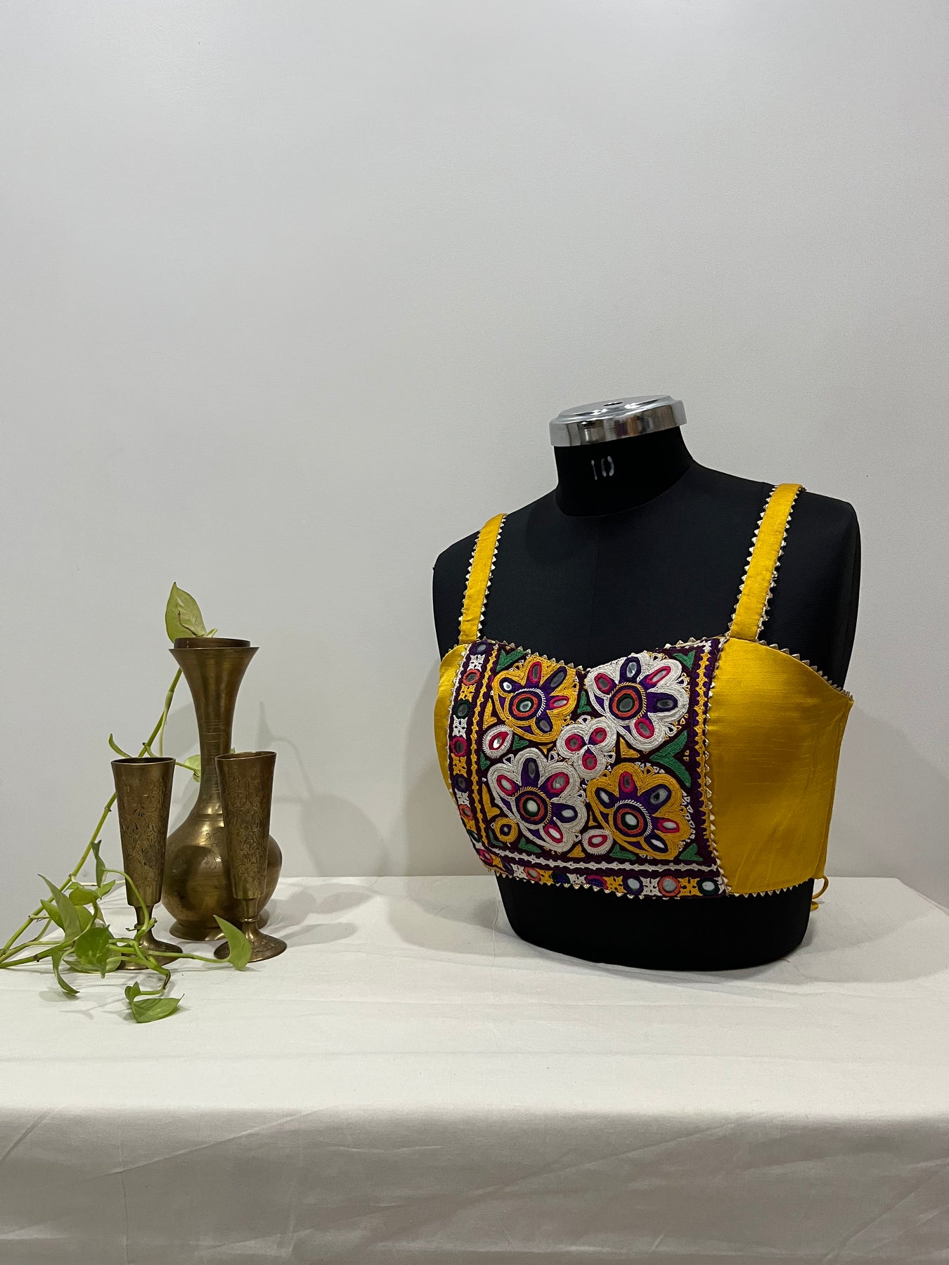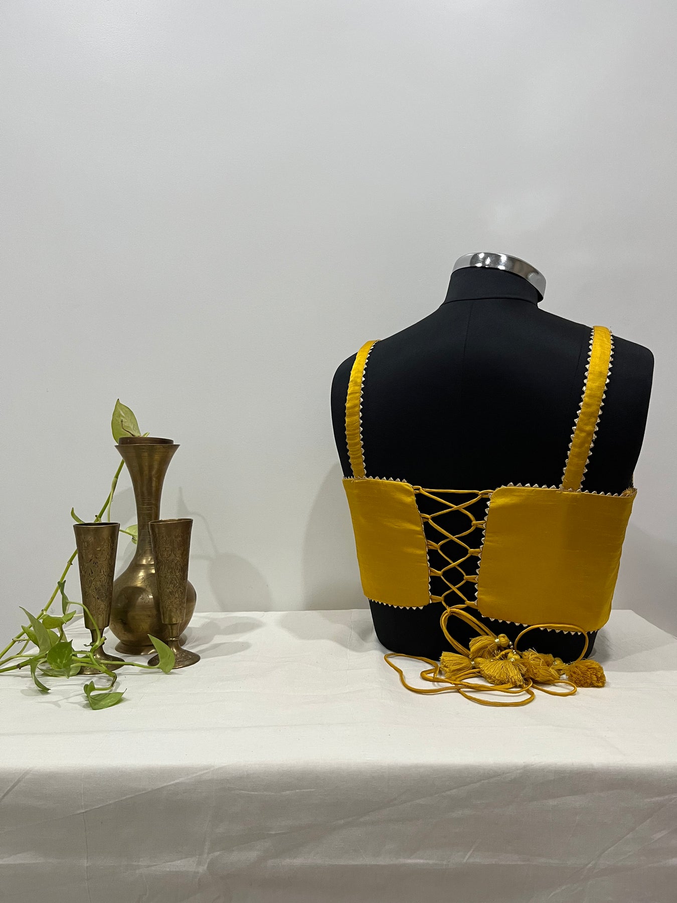 Bright, bold, and rooted in tradition — the Sunlit Kachi Blouse is a vibrant yellow spaghetti blouse crafted in lustrous raw silk satin. The front features a beautifully handcrafted Kachi patch, bringing a burst of artisan flair to this minimal silhouette. Whether paired with printed dupattas or contrasting lehengas, this piece brings sunshine to any festive look.