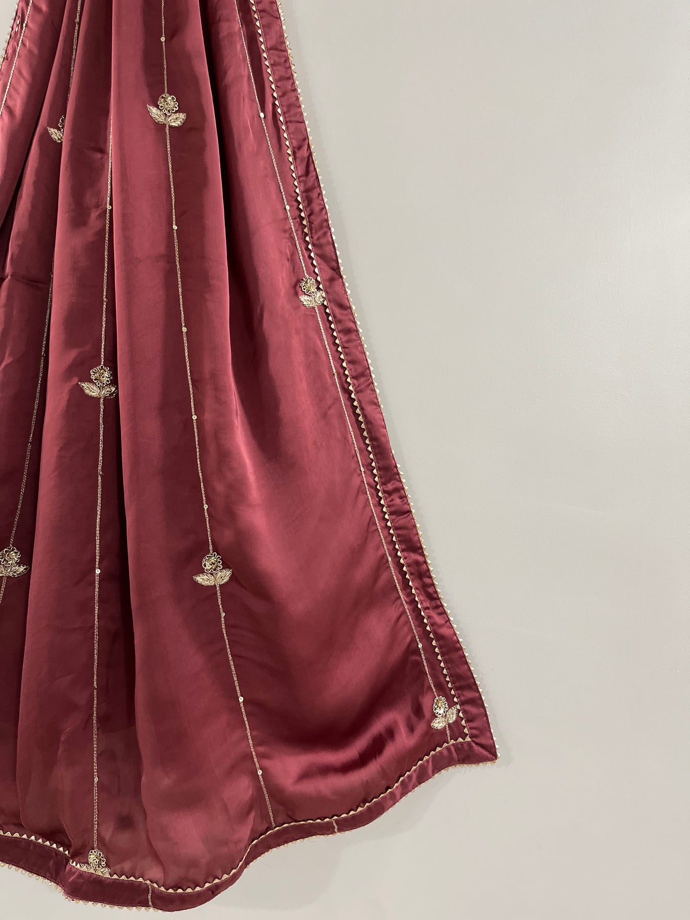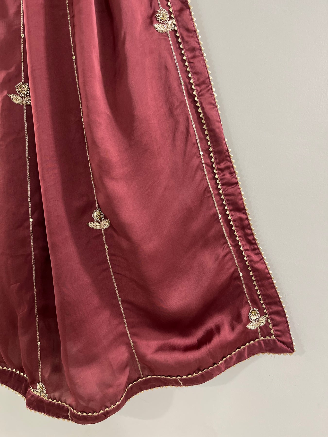 Exude elegance with this rich Wine Rose Dupatta, handcrafted in flowing georgette satin. The deep, romantic hue is beautifully enhanced by hand embroidery in floral and line motifs, using detailed jardori, ari, and tikki work. Whether layered over lehengas or suits, this dupatta brings regal charm and intricate craftsmanship to your wardrobe.