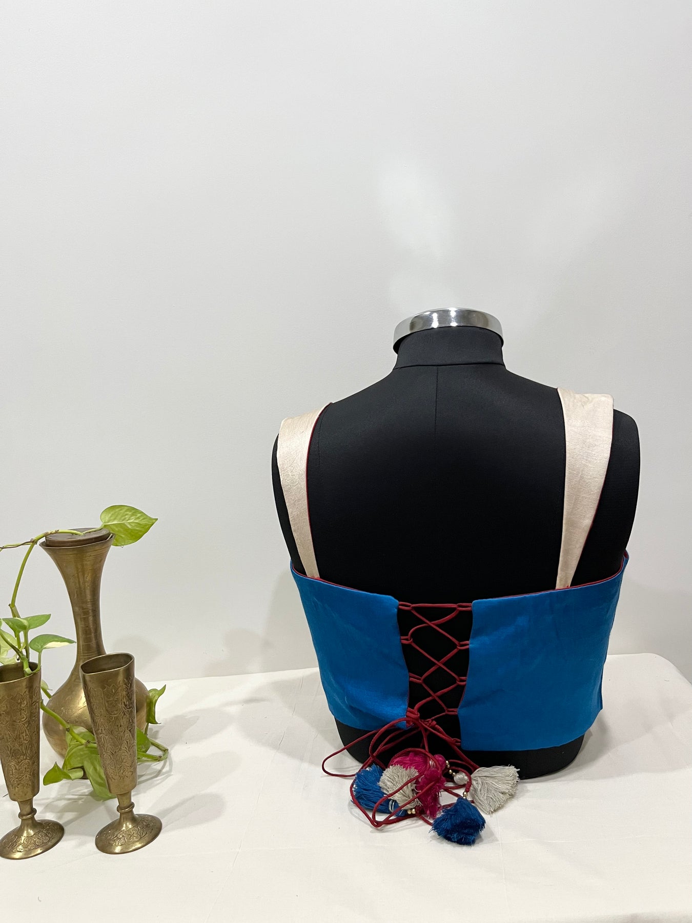 The Meher Blouse is a breezy blend of tradition and festive charm. Made in soft gajji silk, it features a harmonious combination of sky blue, pink, and beige hues. The front yoke is adorned with delicate kasab work, while the back is styled with elegant criss-cross strings, making it both functional and fashionable for Navratri or celebratory events.
