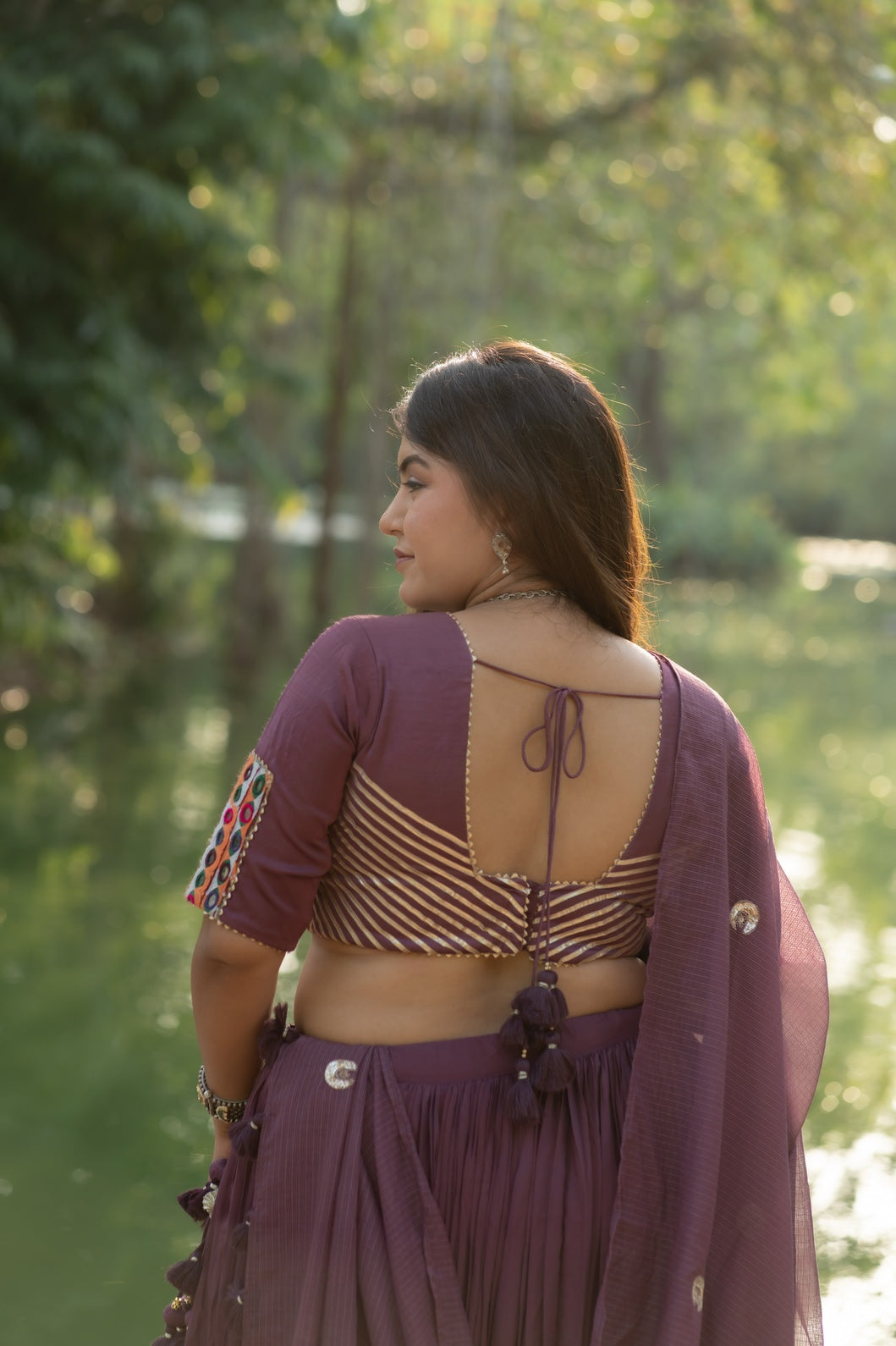 The Mehira Blouse in soft gajji silk is a canvas of refined details. Sleeves feature traditional kachi patchwork, while the neckline boasts multicolored Banarasi fabric accented with kasab embroidery. The blouse is enhanced with toi lace leheriya lines across the front and back — making it festive yet wearable.