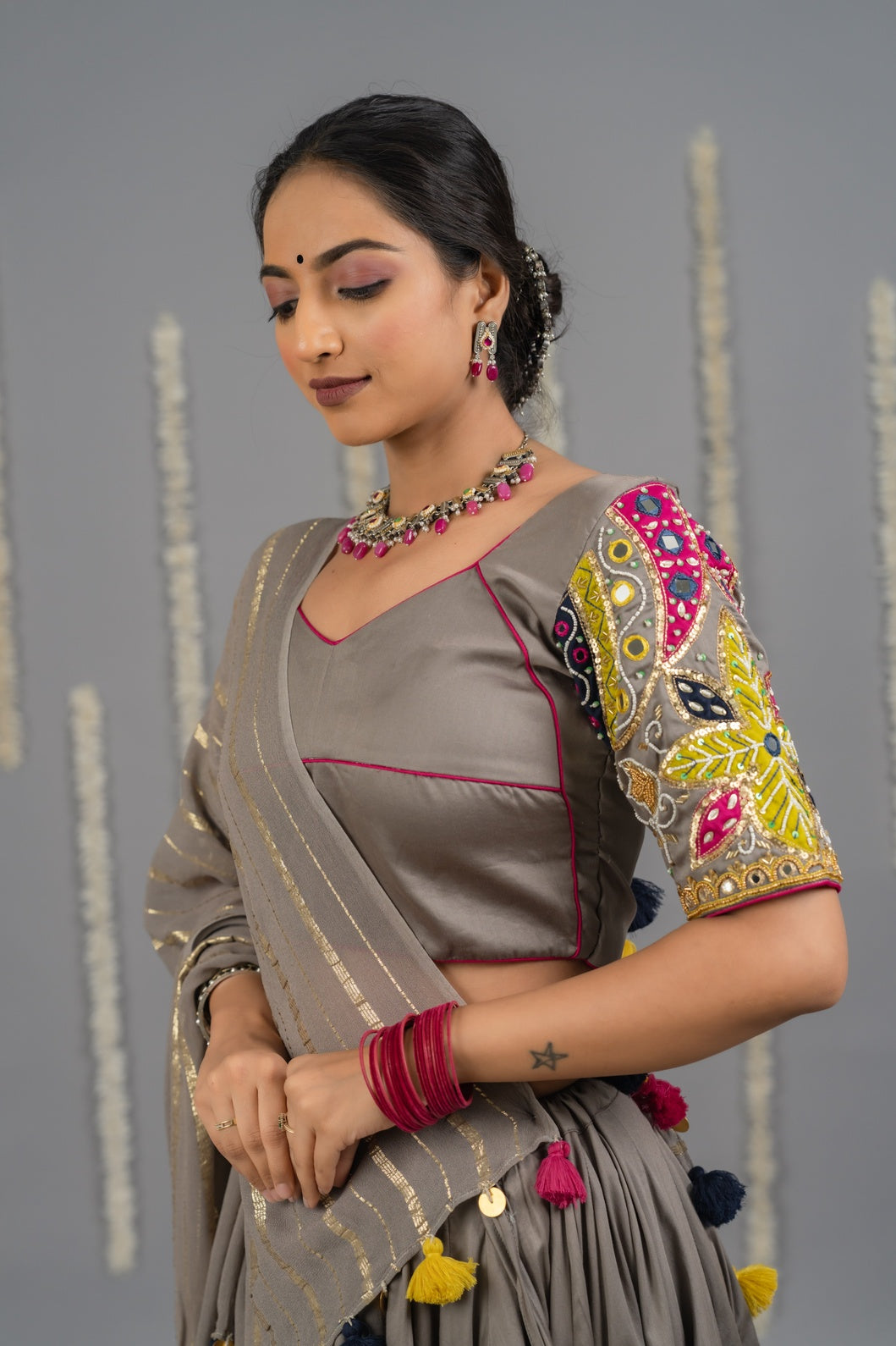 The Saanjh Blouse is a masterpiece in grey cotton satin, featuring multicolor hand-appliqué motifs and mirror embroidery that reflects elegance and craftsmanship. It’s a go-to blouse for pairing across occasions.