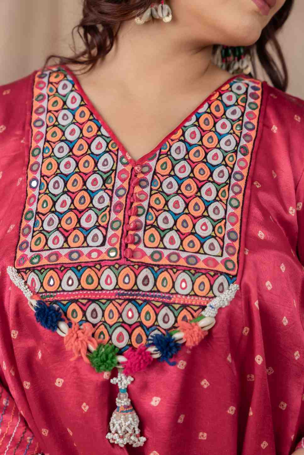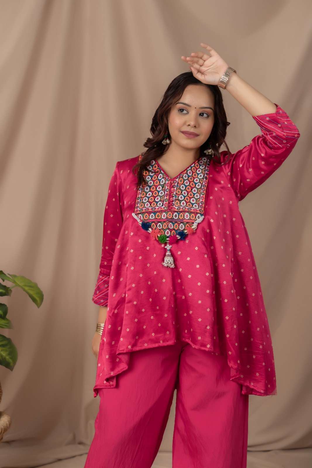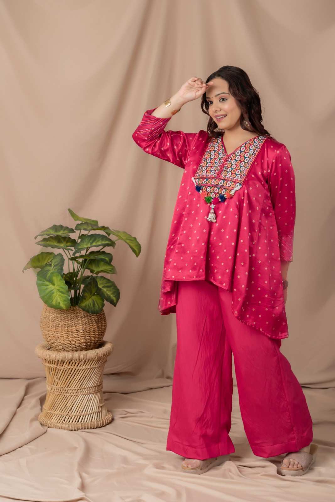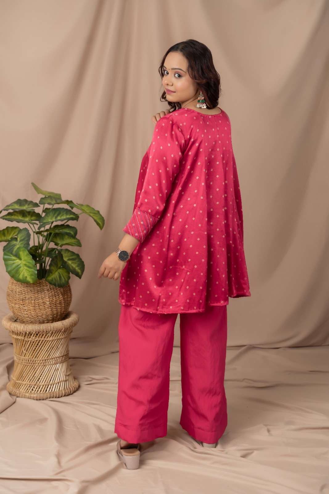 Vibrant, elegant, and effortlessly stylish—the Classic Poppy Set is crafted to turn heads with its timeless charm. The bandhej gajji top showcases authentic hand-dyed artistry and features a delicate, intricate patch that sets it apart with a unique and personal touch. Its rich texture brings a sense of understated luxury. Paired with airy chanderi silk wide-leg pants, this ensemble flows with grace and comfort, perfect for festive gatherings, cultural outings, or refined everyday moments.