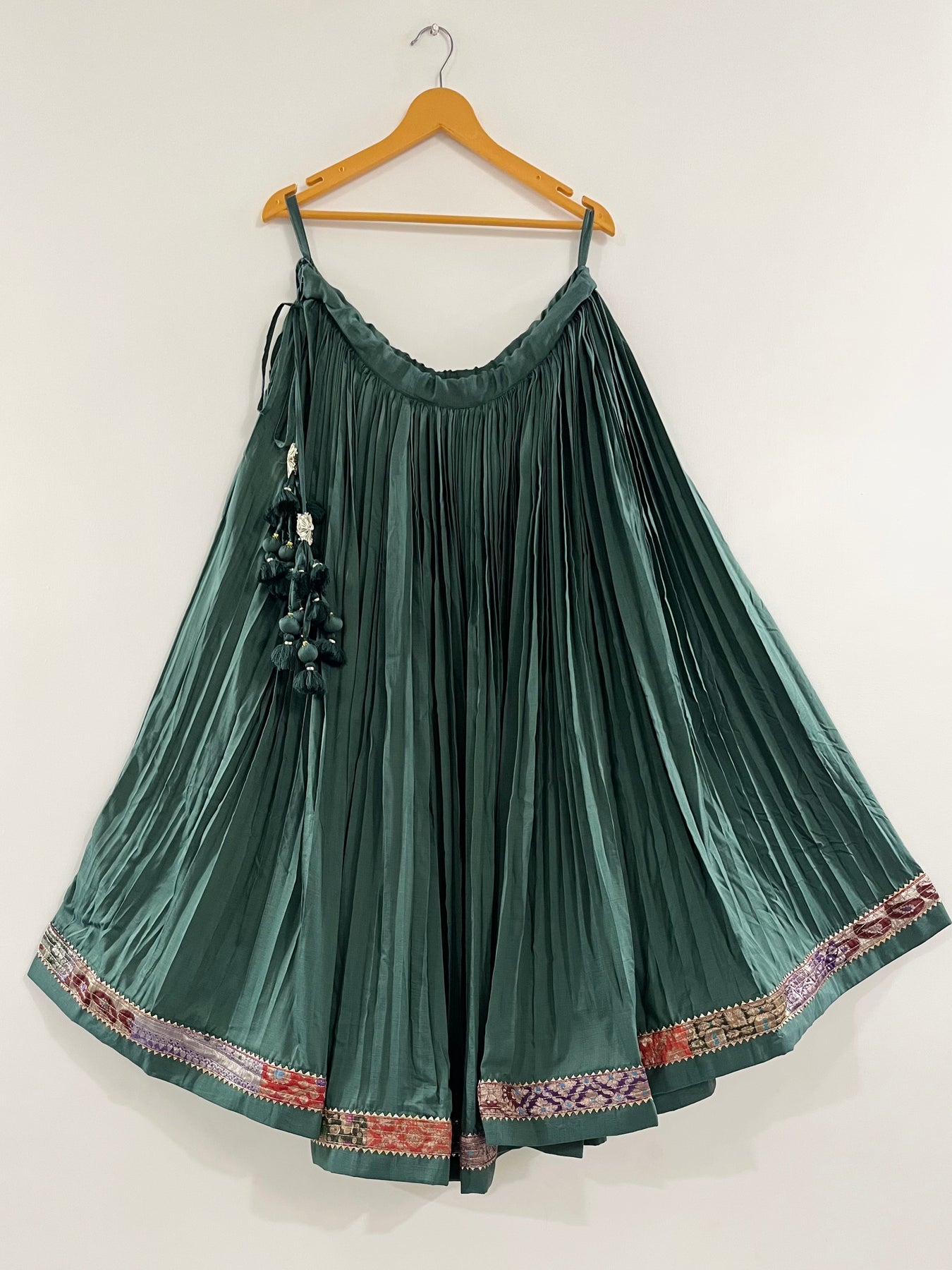 The Eira Teal Green Lehenga is a celebration of vibrant tradition and effortless elegance. Crafted from rich maska cotton, it features a dramatic 8-meter flare that adds a graceful fall and movement. The hemline is adorned with a detailed multi Banarasi border and a fine 1.5-inch kasab line, making it perfect for cultural occasions and festive gatherings.