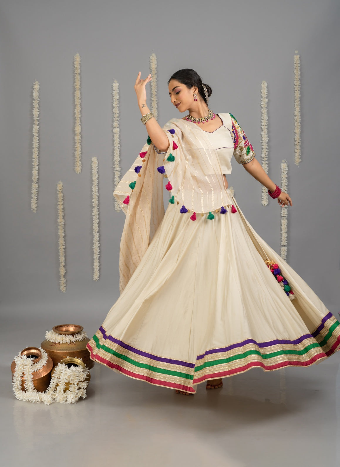 A contemporary classic, the Inaaya Lehenga comes in a soft beige tone, adorned with bright pink, purple, and green border pattis and a signature golden lace finish. Its 12-meter flare creates an effortlessly regal silhouette.