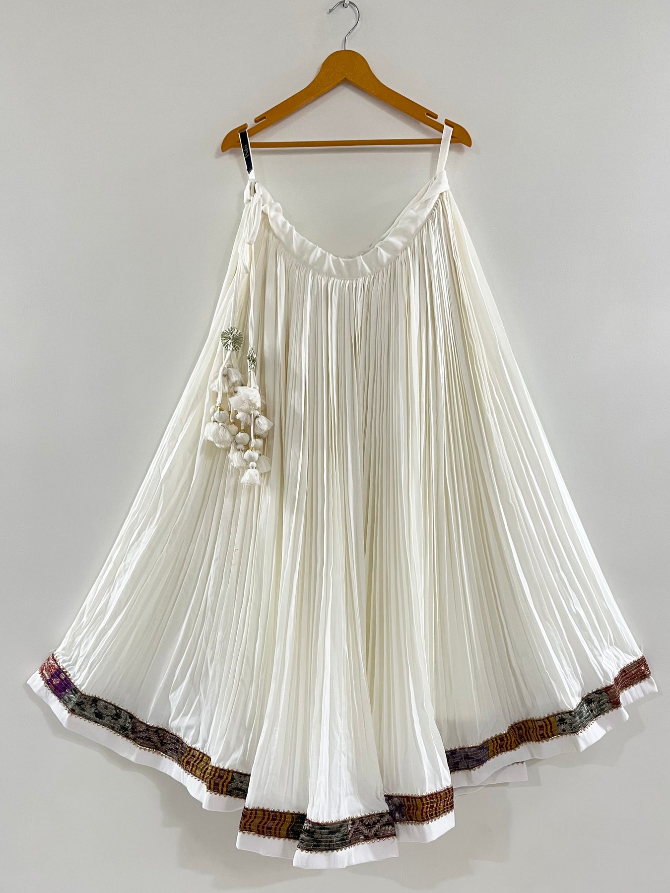 Elegant and minimal, the Nyra Off White Lehenga is tailored from premium maska cotton, offering a perfect blend of tradition and grace. Its voluminous 8-meter flare provides a majestic drape, complemented by a detailed multi Banarasi border and a refined 1.5-inch kasab line, making it a versatile pick for both day and evening celebrations.