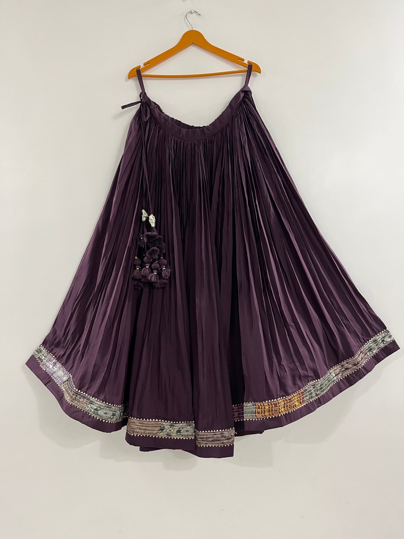 Graceful and rich in tone, the Zariah Wine Lehenga is crafted from luxurious maska cotton with a generous 8-meter flare that ensures dramatic movement and elegance. The hemline features a 1.5-inch kasab line paired with a multi Banarasi border, adding heritage charm to this contemporary classic. Perfect for festive evenings and special ceremonies, it brings together comfort, tradition, and statement style.