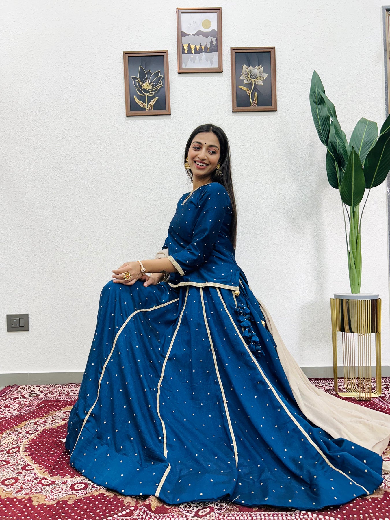 Radiant and graceful, the Peacock Blue Set is a beautifully designed Indo-Western ensemble that combines elegance with a modern silhouette. The outfit features a rich, flowy textured silk-blend top that captures the deep allure of peacock blue, offering both sophistication and charm. The cotton satin bottoms provide soft structure and comfort, while the light beige dupatta crafted in the same textured silk-blend adds a soft contrast to the rich tones of the set.