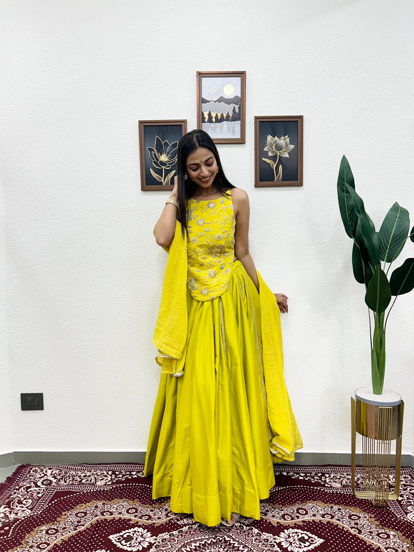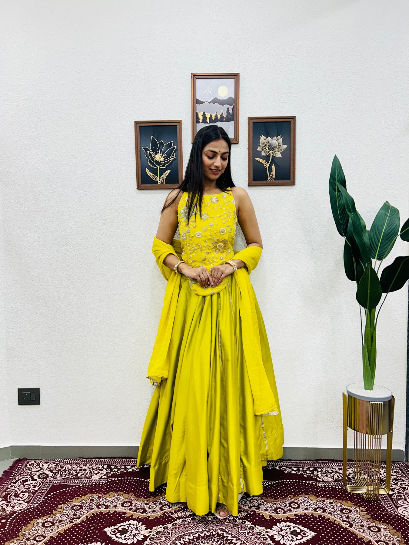 The sunny yellow tone, paired with luxurious fabric choices, makes this outfit a standout piece for any occasion.