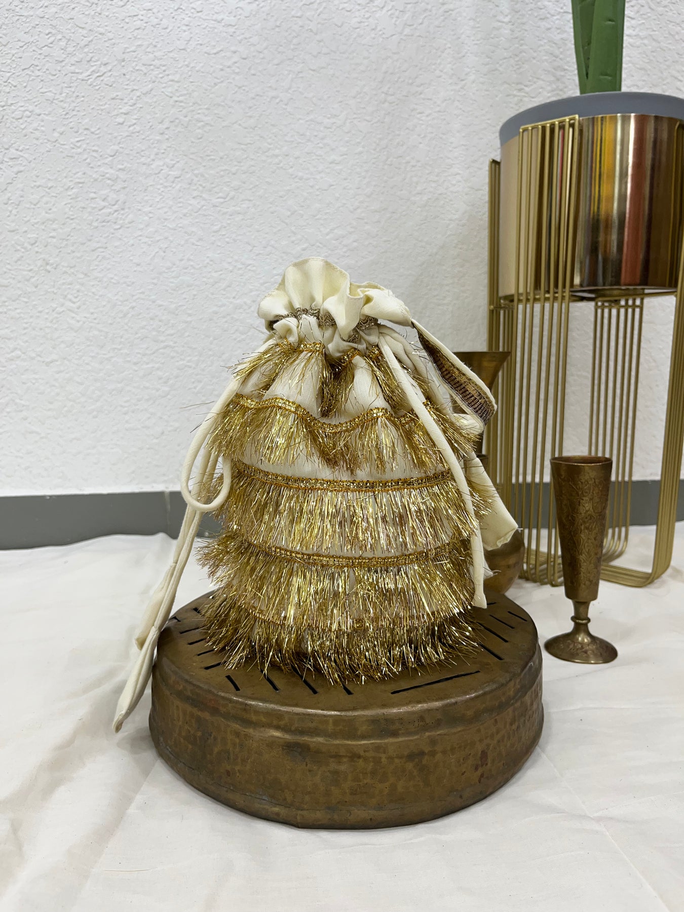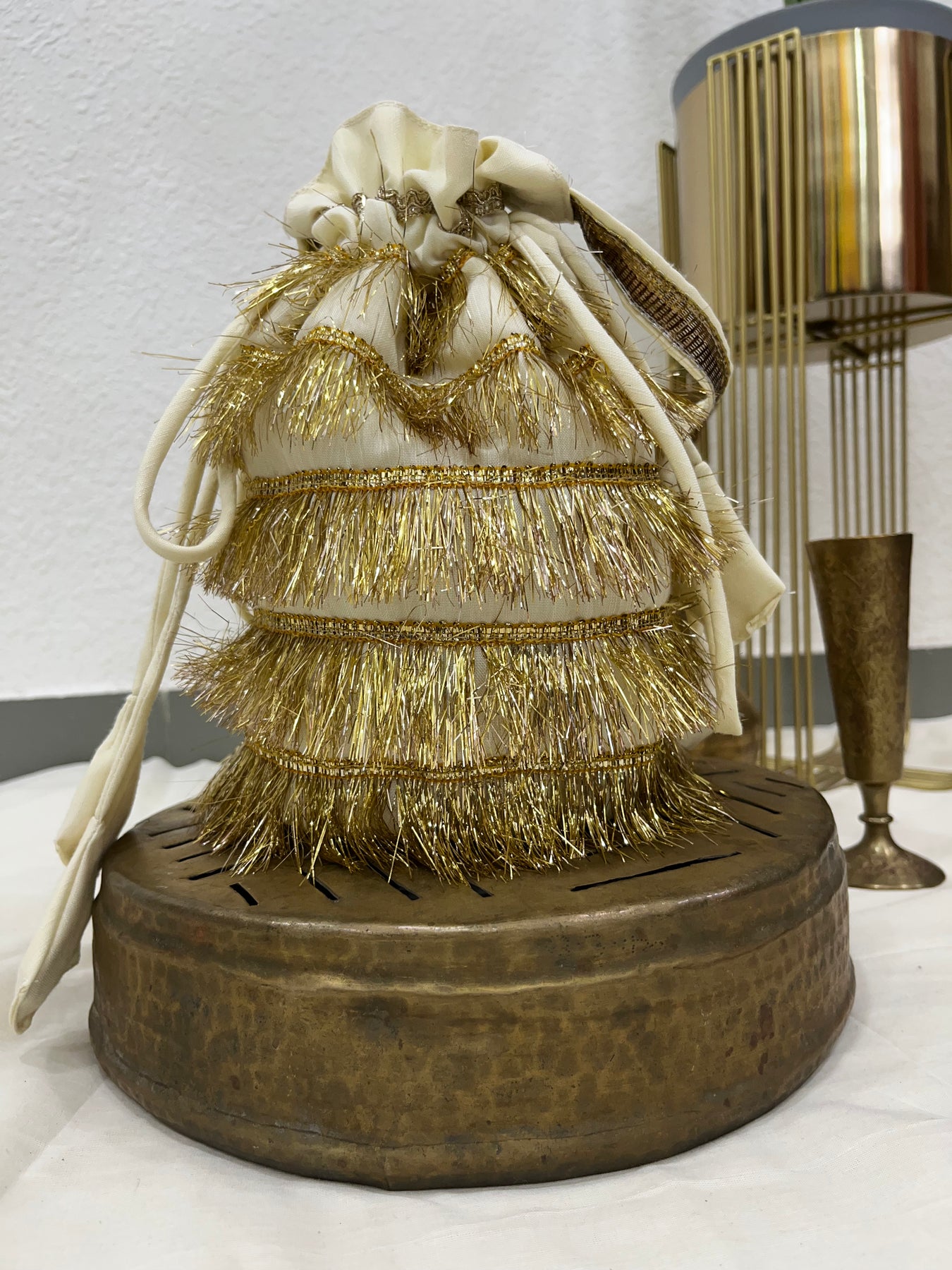 Elegant in its simplicity, the Noor Potli in off white is a refined accessory crafted from smooth cotton satin. The potli is beautifully accented with delicate golden frills stitched along the edge, adding a subtle festive charm to its minimal look. Lightweight and graceful, it's perfect for complementing both traditional and contemporary outfits.